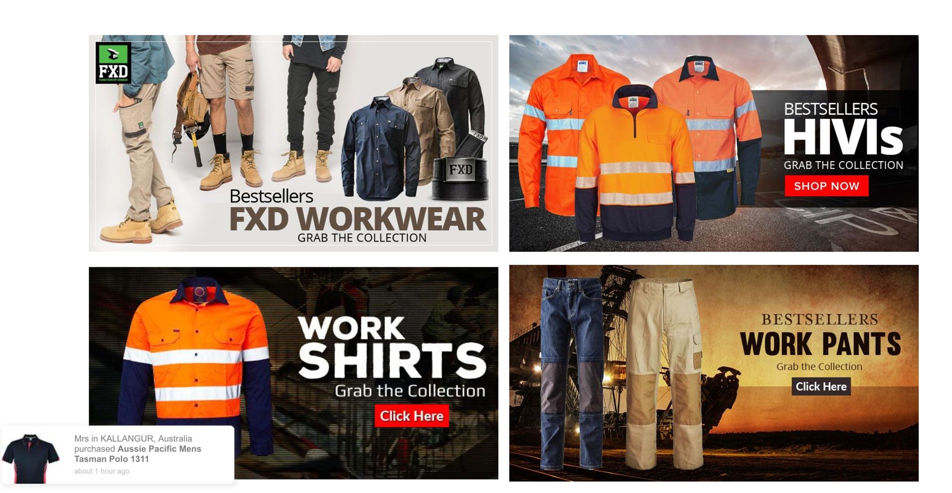 Their store showcases a massive range of industrial workwear, trades workwear, business uniforms, safety work boots, personnel safety equipment, casual workwear, corporate workwear, school uniforms, hospitality workwear, restaurant uniforms, and promotional products.