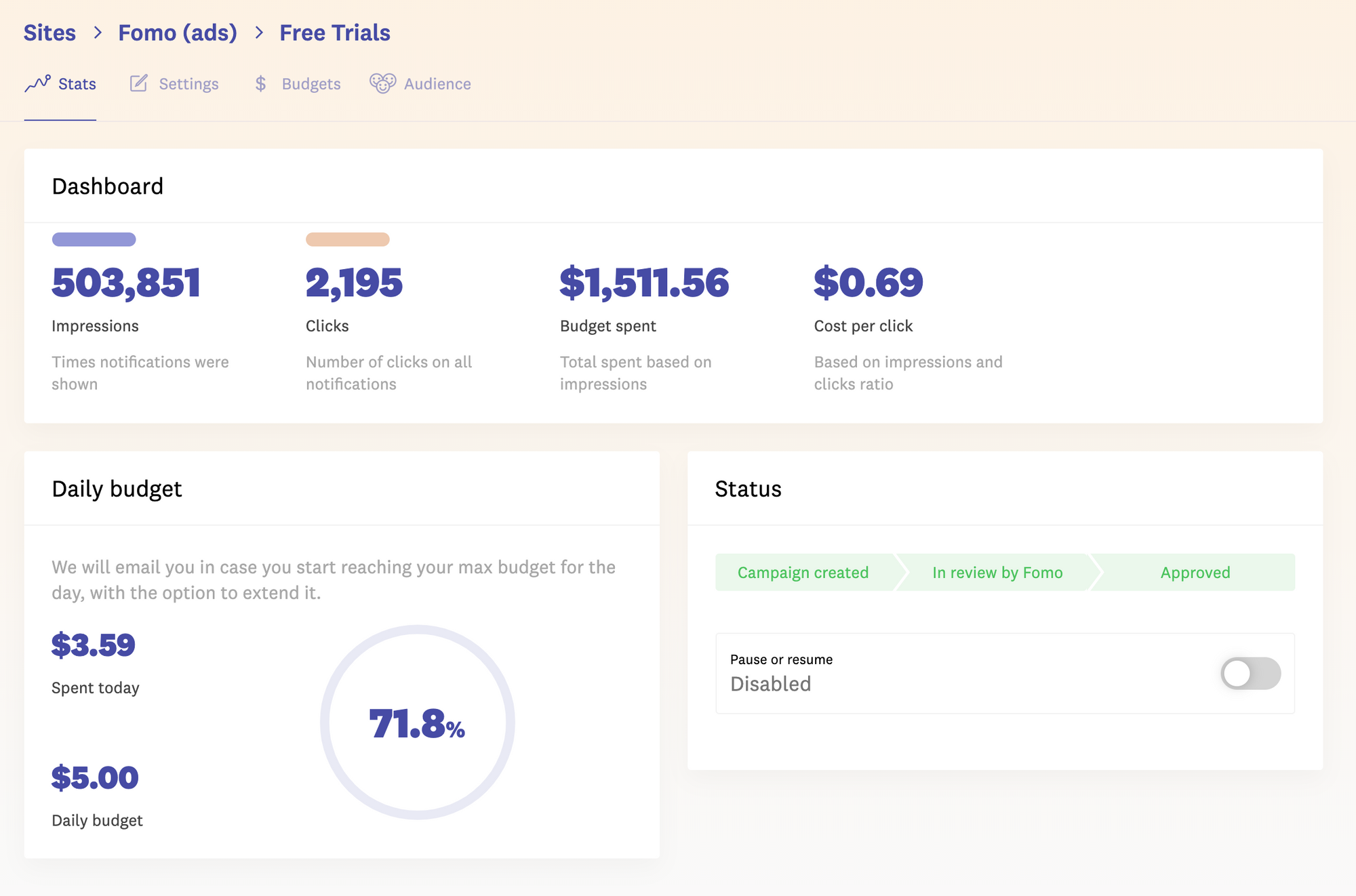 here's a screenshot from one of our own ad campaigns, which advertised Fomo on our site Built With Shopify.