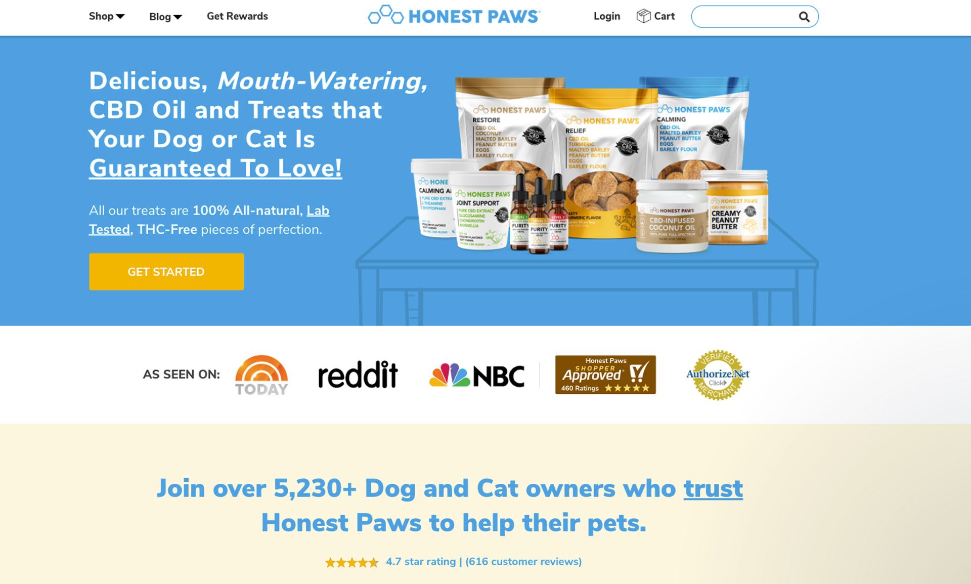 Honest Paws' store has an incredible landing page full of trusted and recognizable features from popular companies, photos of their product in action and glowing customer reviews. What else could they need?
