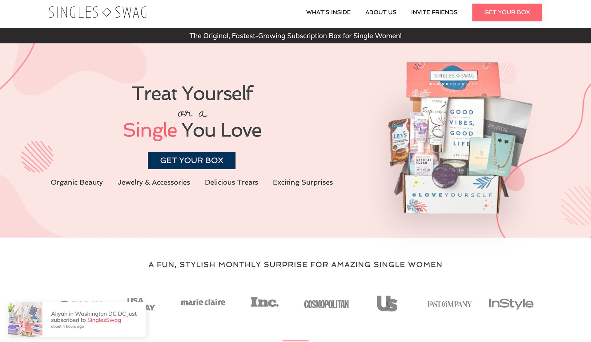 “SinglesSwag is the first and largest monthly subscription service designed for single women. Boxes feature hand-selected, full-sized items from categories like organic beauty, cosmetics, jewelry and fashion accessories, books, treats, and a lot more.”