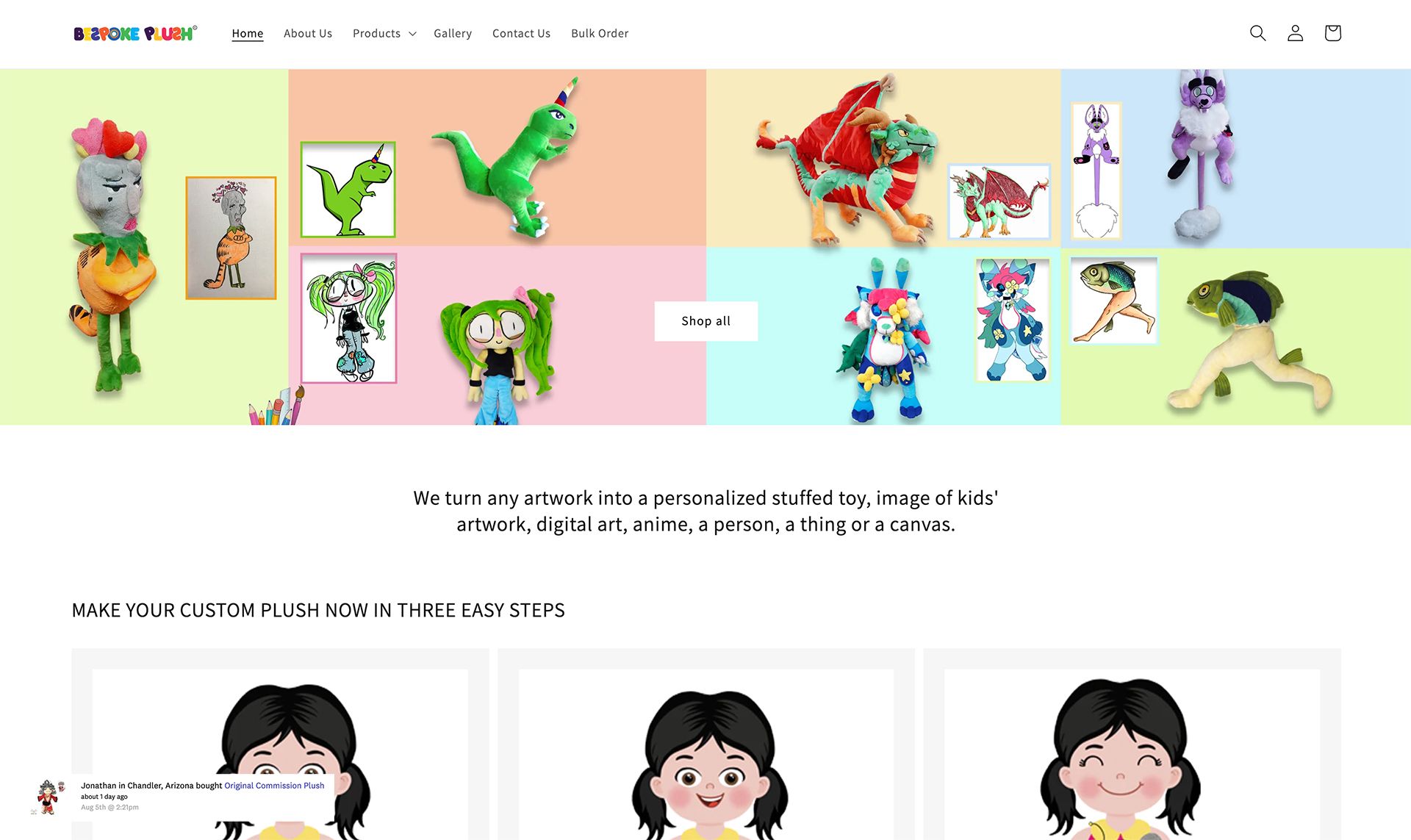 Bespoke Plush designs and creates bespoke plush toys and cute plushies based on characters from drawings, personal artwork, or electronic sketches. The company can turn any artwork or drawing into a personalized and soft stuffed toy.