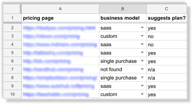 this reduced our dataset to 69 websites, which i manually visited 1 by 1 to review their pricing model and point of view.
