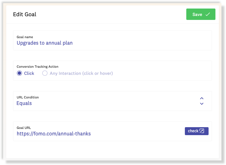if your visitor clicks or hovers (depending on goal settings) a Fomo notification and then lands on the URL paths you've specified in a Scorecard goal, Fomo upticks your conversion counter.