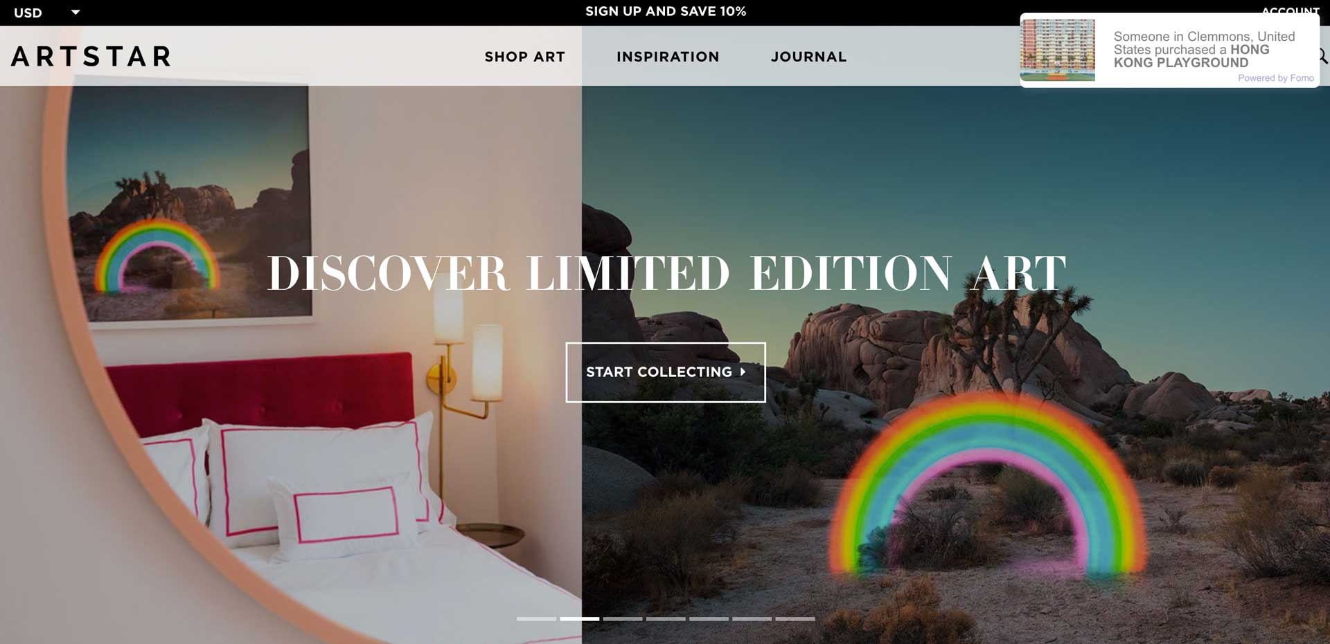 ArtStar is a perfect example of utilizing Fomo’s ability to create urgency within a store, especially selling limited edition art. Any questions of whether or not it’s safe to buy from them are eliminated when prospective customers can see others taking the leap ahead of them.