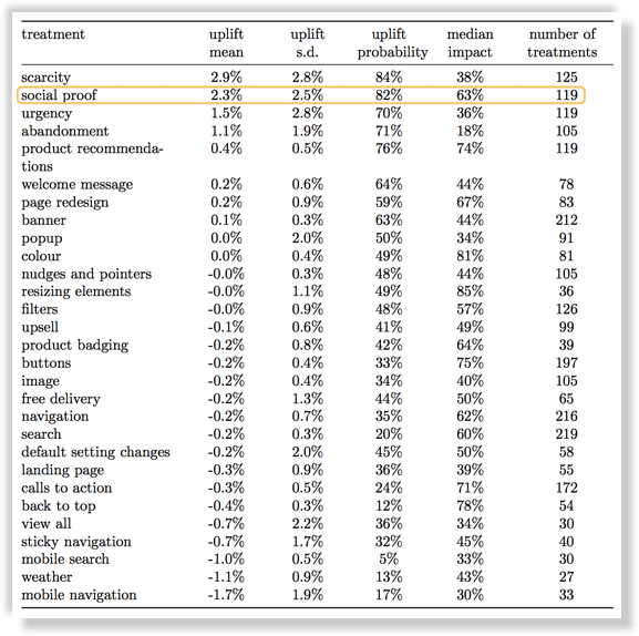 social proof was just 1 of 29 different treatments tested on these stores, with others ranging from Free Shipping to Mobile Search.