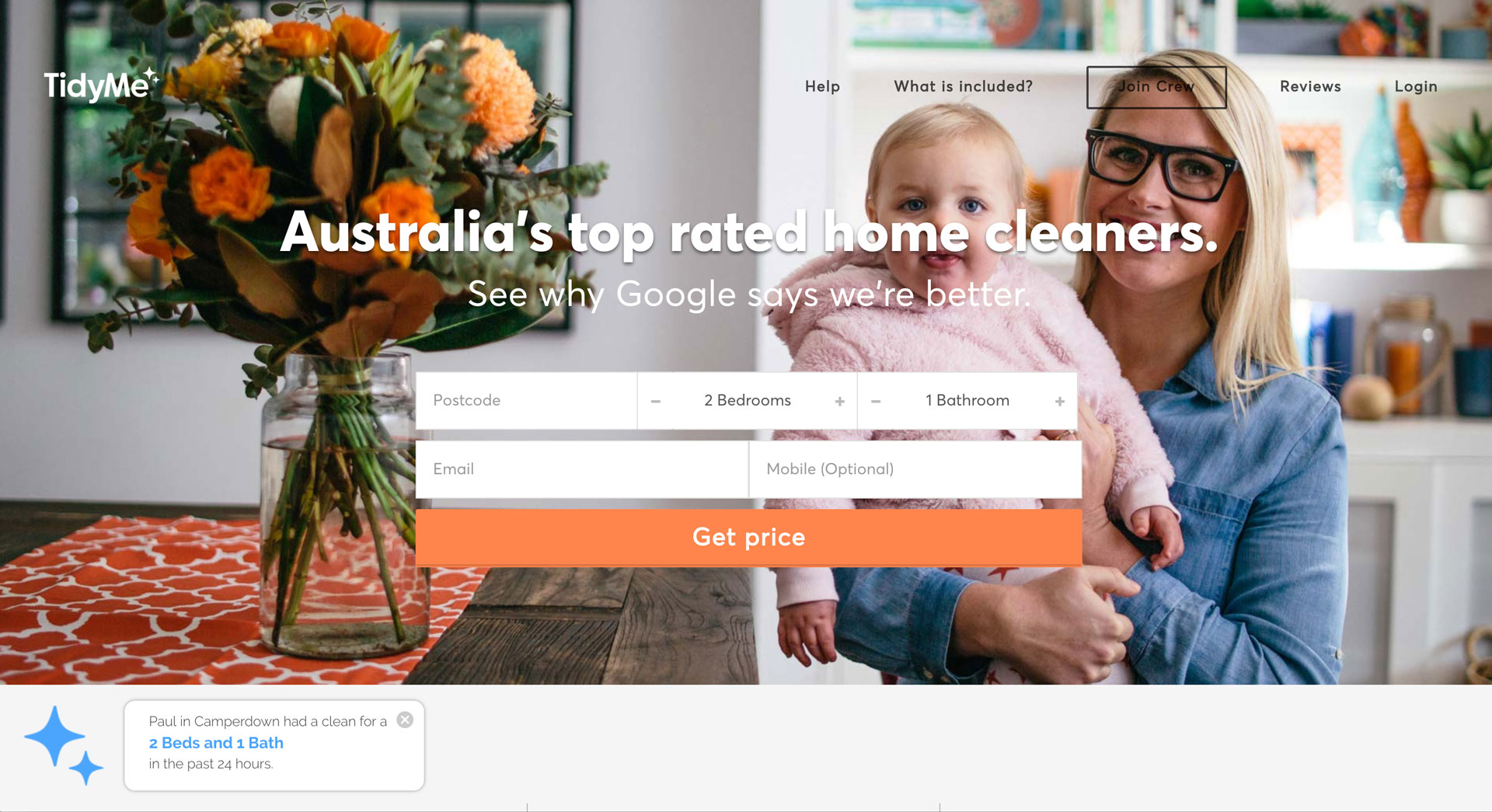 "We drive conversions with the 'live time' feed - provided by Fomo - which gives visitors to our website an idea of the amount and frequency of critical actions that users take on our website: rating cleans, completing cleans and becoming customers. This ensures that visitors are aware of how other users are getting value. TidyMe and enables them to perceive how they, too, can obtain the same value."